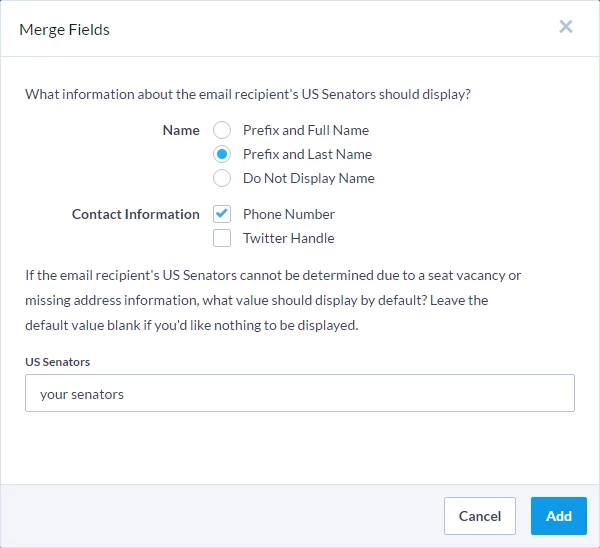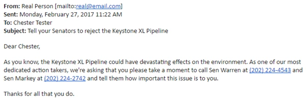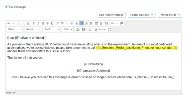 When you're trying to motivate your supports to take action right away, you can make it much easier for them to get the information they need by using a merge field to customize your Targeted Email with the name and contact number for the correct elected official from your supporter's district.