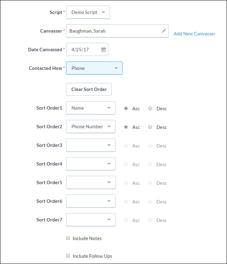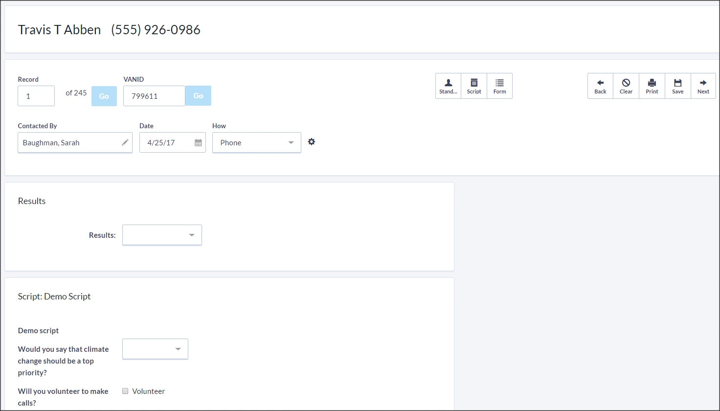 Next, choose which Script to use as the basis for data entry, as well as the canvasser (person who contacted or attempted to contact the record) contact method.