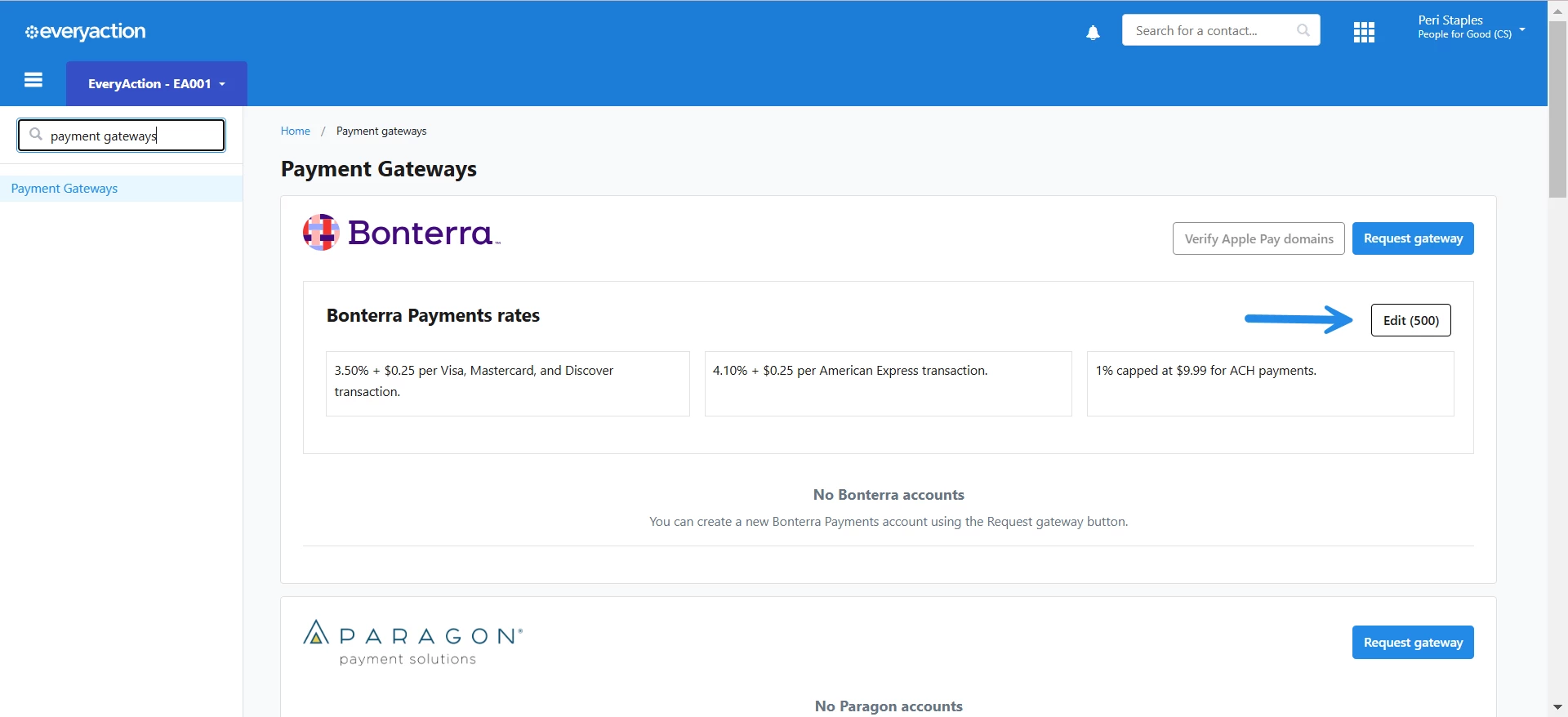 From the Payment Gateways page, find your Bonterra Payments Gateway. If you manage multiple gateways, ensure you are selecting the correct one.