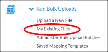 In the Run Bulk Upload menu, you may see My Existing Files, which allows you to access the most recent ten uploads they have been working on. Please note that once a bulk upload has been completed, it will no longer appear in My Existing Files.