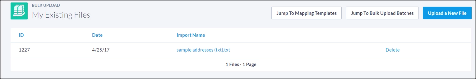 From the Bulk Upload Files List, you can delete existing uploads. You can also jump to templates or batches (Administer Bulk Upload Batches), or upload a new file.