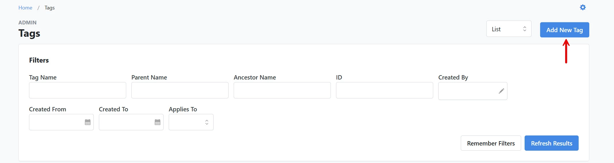Click the 'Add New Tag' button in the upper right corner of the 'Tags' page.