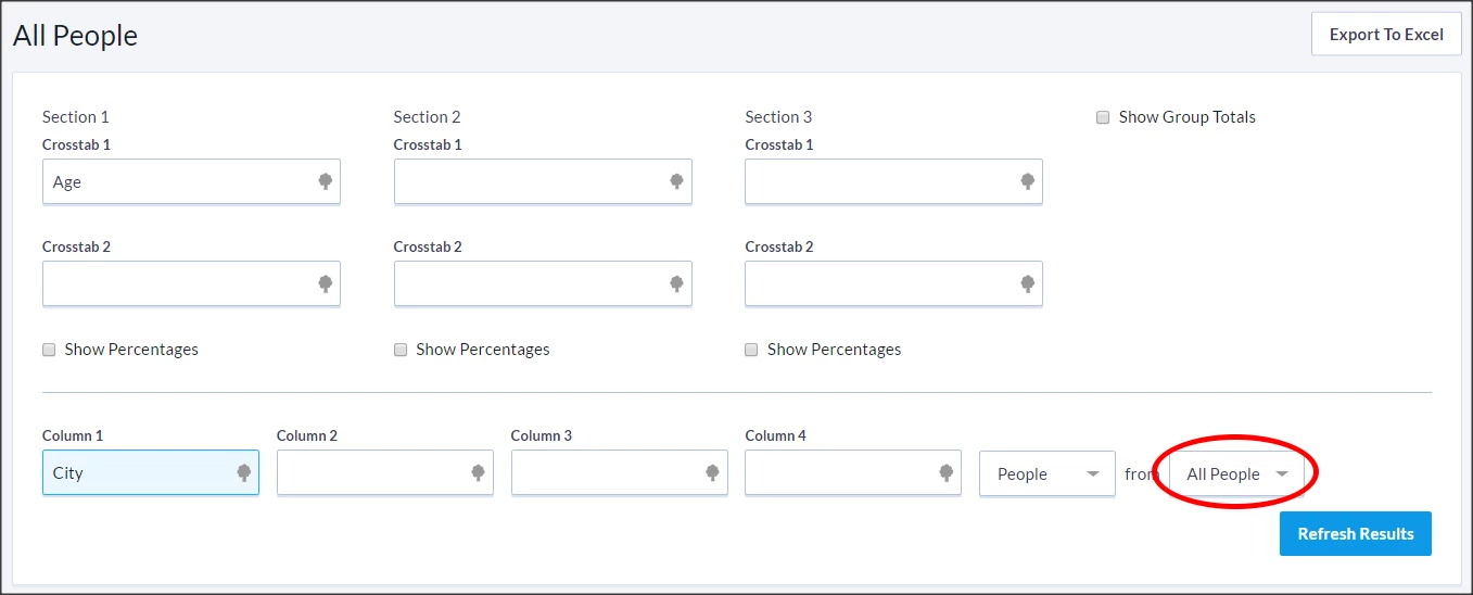 If you open Counts & Crosstabs from Report Manager, the tool will default to analyze the entire universe in the database ('All People'). You can adjust the universe by using the dropdown just above and next to the Refresh Results button. You can also use the dropdown to the left to view counts of people (i.e. contact records), doors, mailboxes, or phones.