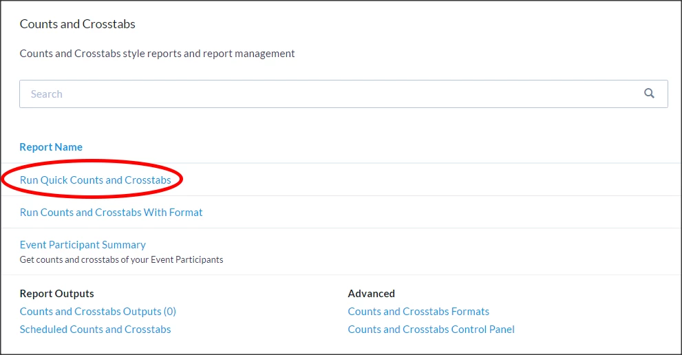 What is the difference between "Run Quick Counts and Crosstabs" and "Run Counts and Crosstabs with Formats"? Counts and Crosstabs with Formats allows user to create default settings for this report. Formats can be shared with other users. This ensures that everyone should be looking at the same report, assuming they have access to the same records and data in the system. In contrast, Quick Counts and Crosstabs does not have any default selections for rows and columns.