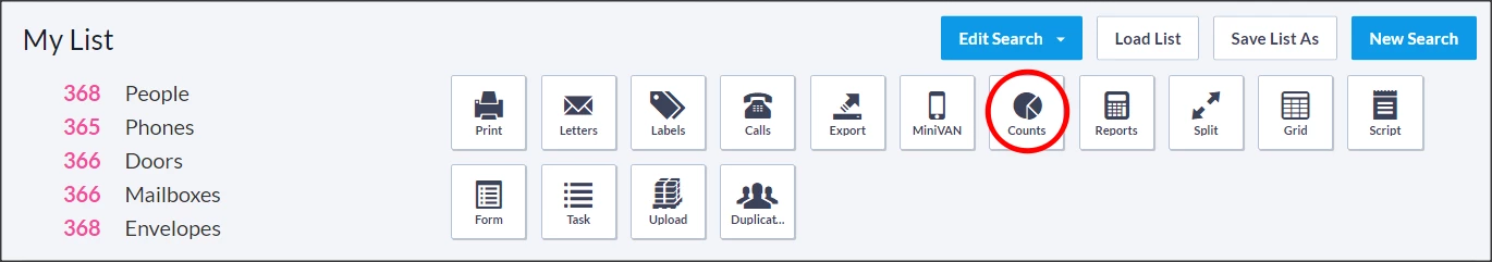 There are two ways to access Counts and Crosstabs. The first is from the My List page. If you have created a list of records for which you'd like to analyze with Counts and Crosstabs, you can click on the Counts icon on the My List page.