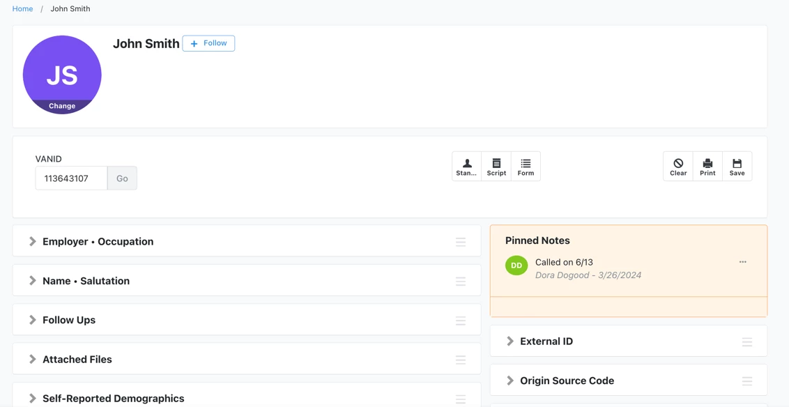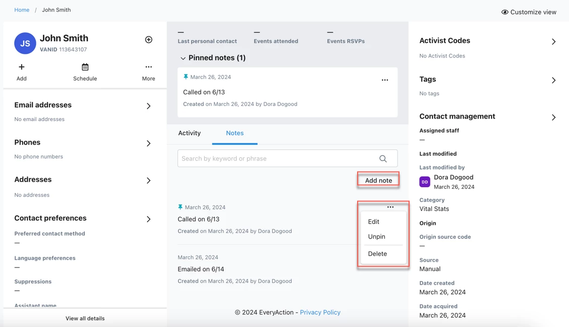 On the standard contact record view, the functions are the same. Pinned notes are displayed at the top of the contact record. Switch from the Activity tab to the Notes tab to see the options for adding, editing, unpinning, and deleting notes.