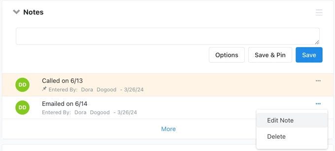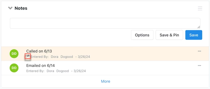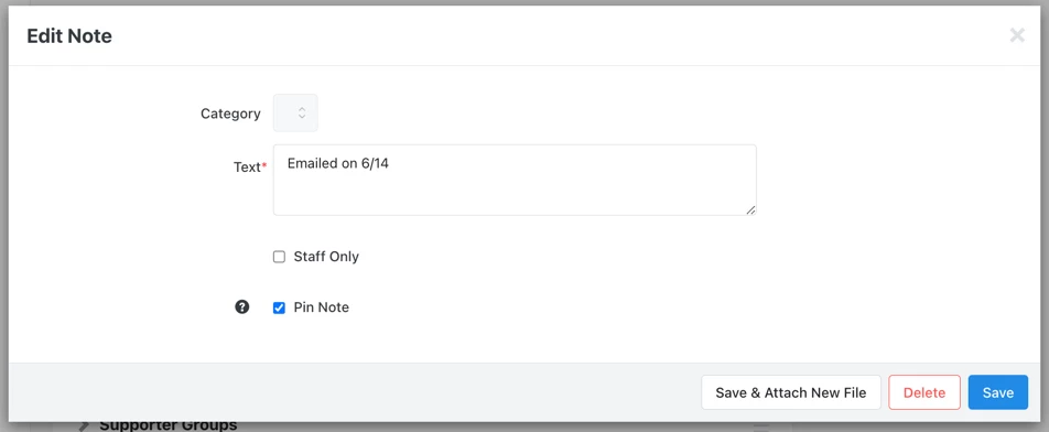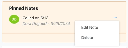 To remove a pinned note, find the pinned note at the top of the contact record or in the Notes section and click Edit Note.