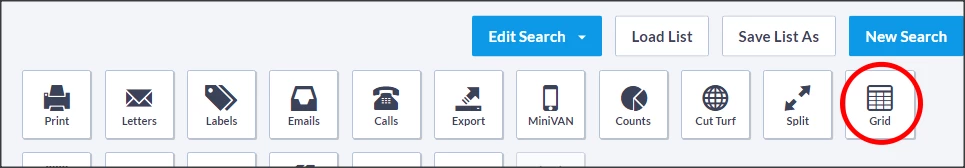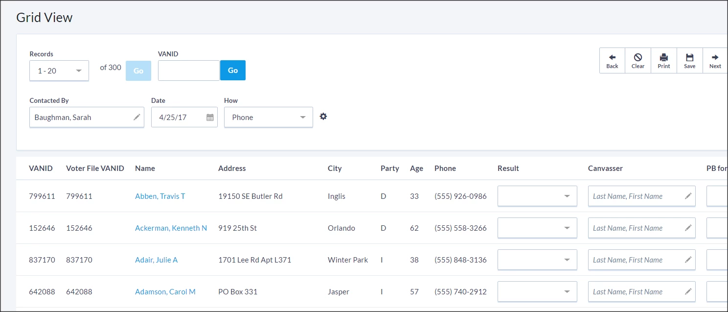 Grid View allows you to see everyone on your list on the same page. Simply select a result from a dropdown menu and move on to the next person. This view is the most popular way to enter data into the system, as it is generally the fastest way to manually enter data into the system; it is available for lists of 100,000 contacts or fewer.