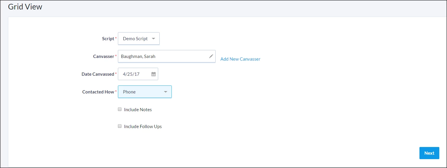 After selecting the option you want, you can choose which saved scripts to use, the canvasser, canvass date, and contact method. The script determines what information can be edited or added to the record, based on the fields and contact methods that have been added to the script.