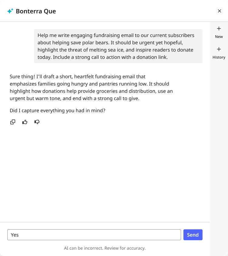 In the chat, type your request with as much campaign context as possible. The more detail you give — like the purpose of the message, recent impact, or timing — the better the draft will be.