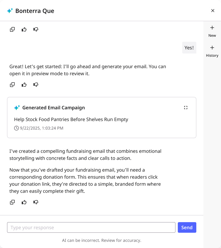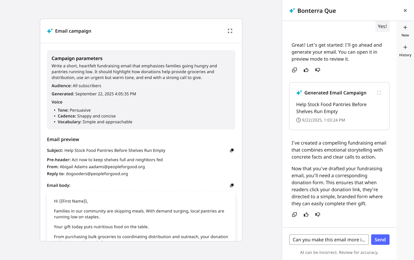 Que will generate a complete draft — including subject line, pre-header, body copy, and CTA — written in your organization’s brand voice.