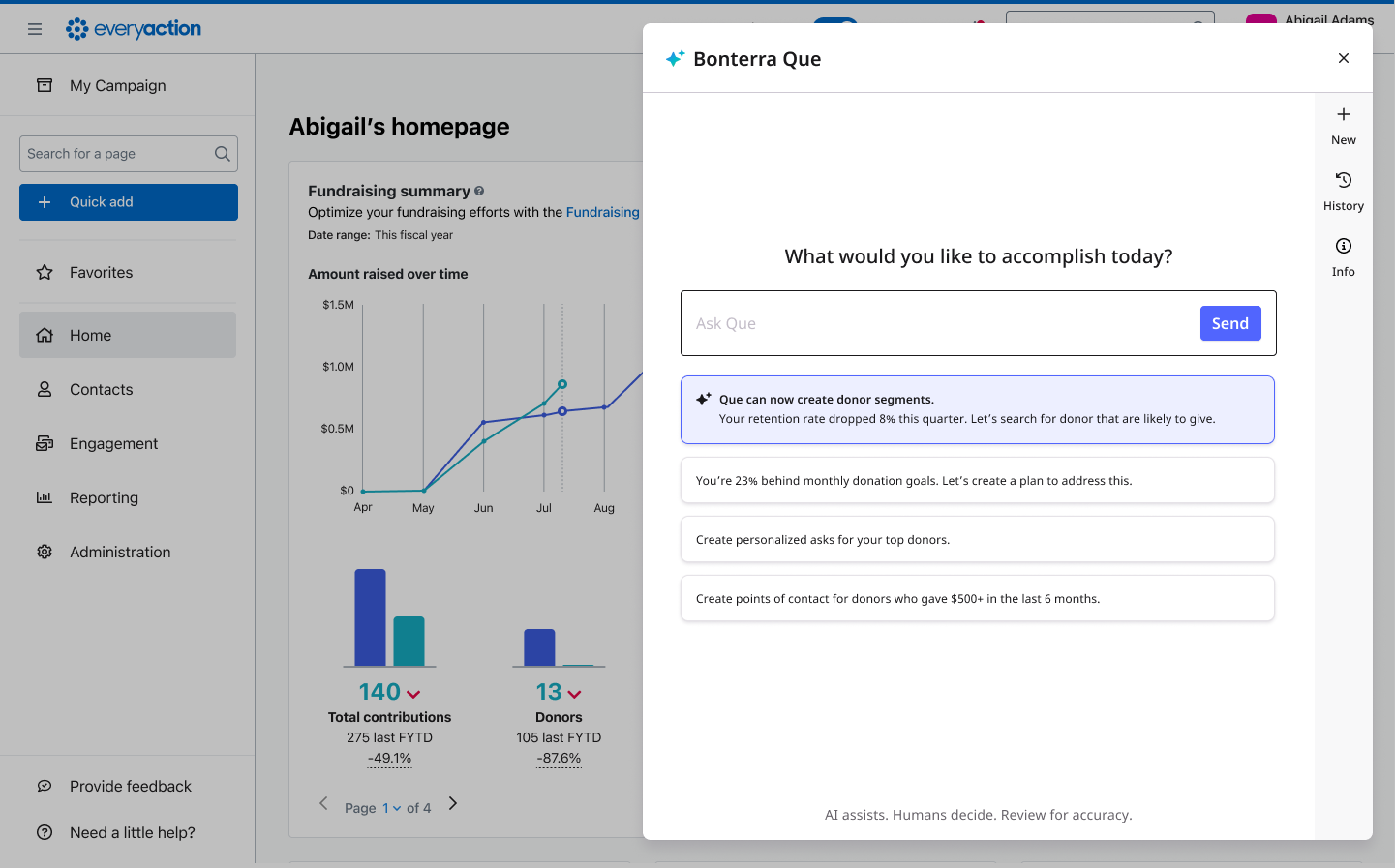 From your EveryAction dashboard, click the Ask Que icon in the middle-right of the page to launch the assistant.