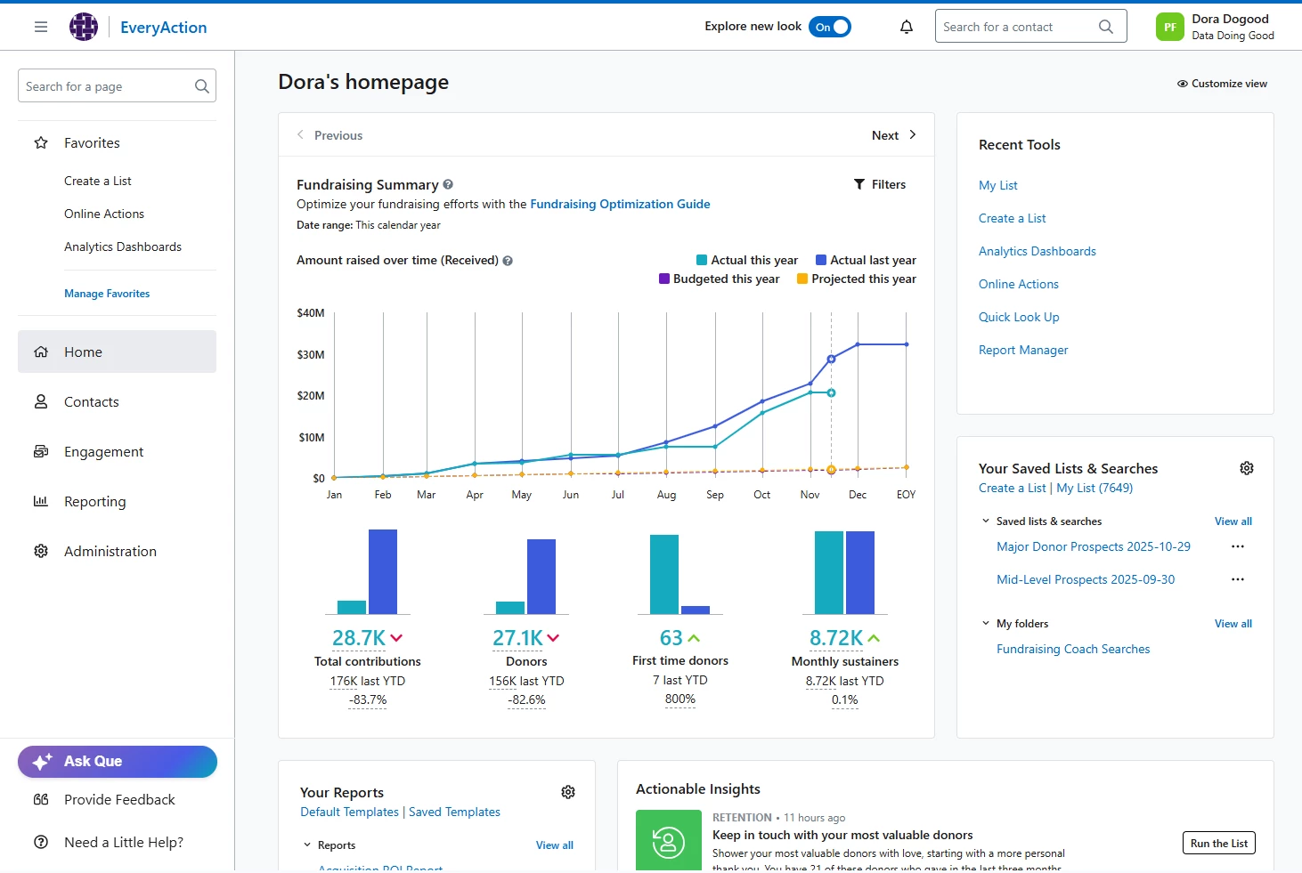 EveryAction’s new navigation and homepage is designed to provide you with a cleaner, faster way to navigate through your EveryAction tools. With the addition of agentic AI like Bonterra Que, and a customizable layout designed to best suit your workflow, you can do even more - faster.