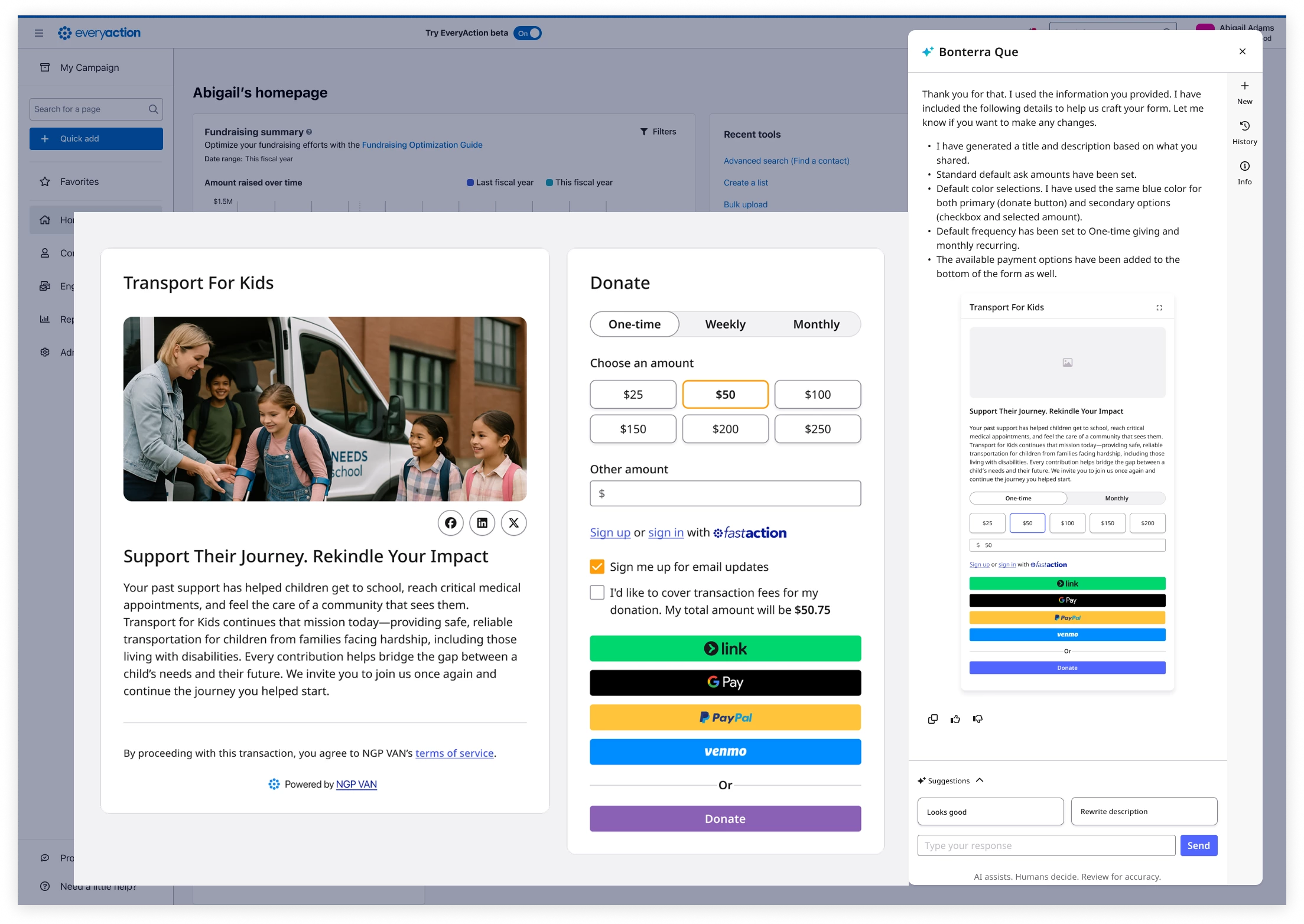 Bonterra Que now helps you create contribution forms in seconds - just describe your campaign, and Que generates a draft form for your review that maintains our established best practices, while still retaining the essence of your campaign.
