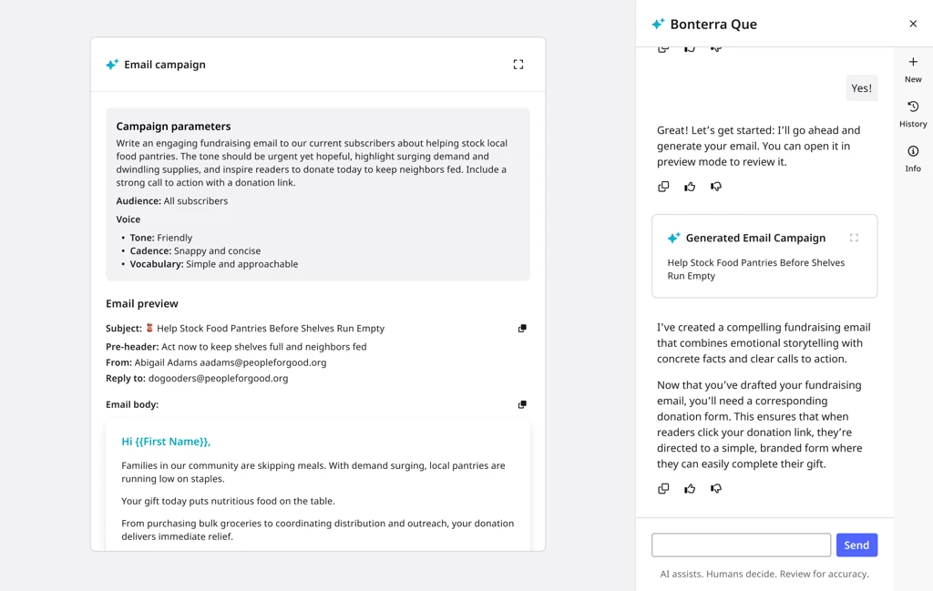 With Que, you can now create personalized, on-brand fundraising emails that follow best practices and fit your audience. Just describe the campaign, and Que drafts a ready-to-edit message that matches both your audience and your tone.