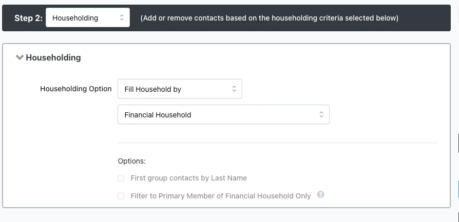 TLDR: We want to create a list of donors who haven’t received contact in a year, but we don’t want that list to include the spouses/partners of people who we have contacted. How do we filter contact status by household rather than by profile?