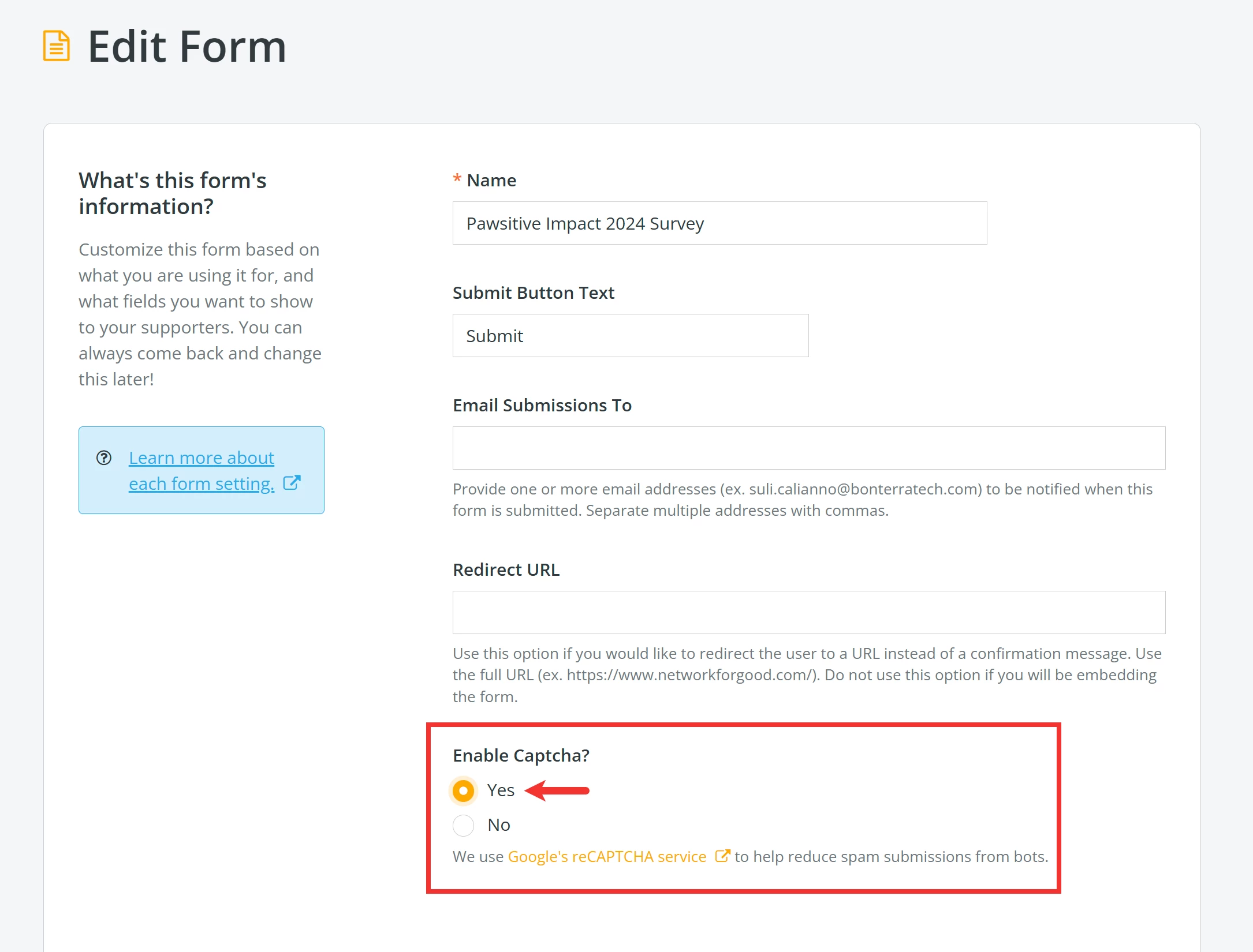 How do I enable reCAPTCHA on my form in Network for Good? | How do I stop spam submissions on my form? | Why am I getting bot submissions on my form? | Where is the Enable Captcha setting on my form? | Can I turn off reCAPTCHA on my form? | How does reCAPTCHA work on Network for Good forms? | Why should I use reCAPTCHA on my registration form?
