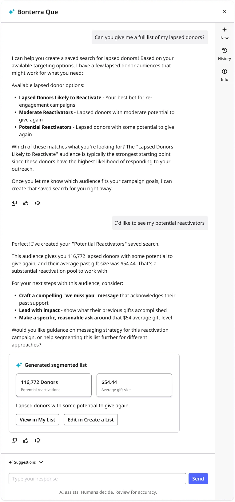 Bonterra Que connects insight to execution, helping you launch high-impact fundraising campaigns in less time. Whether you're targeting lapsed donors, boosting sustainers, or kicking off year-end appeals, Que walks you from data-driven strategy all the way through building your segment, form, and email — without leaving the app.