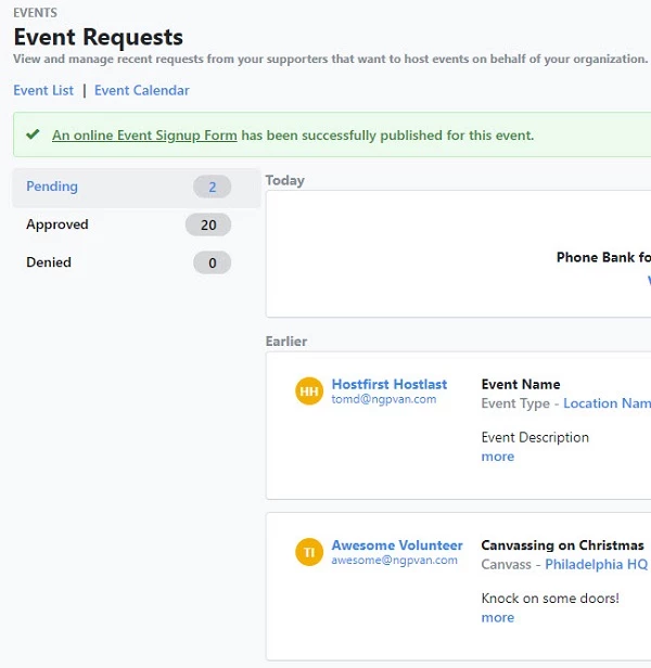 Clicking Approve Event will return you back to the Event Requests page, with a notification that the Event Signup Form has been created.