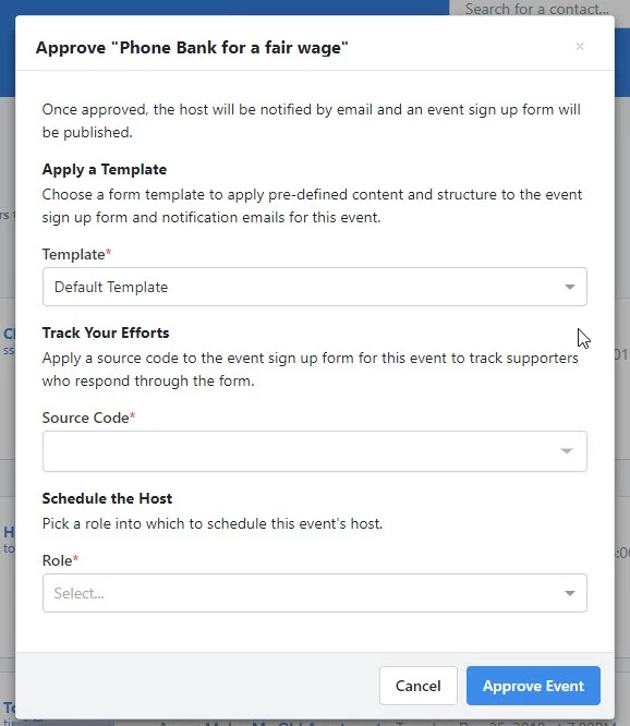 Clicking the Approve button will cause a popup to appear, where you must select which template to use for the Event Signup Form (which includes settings for notification emails to registrants).