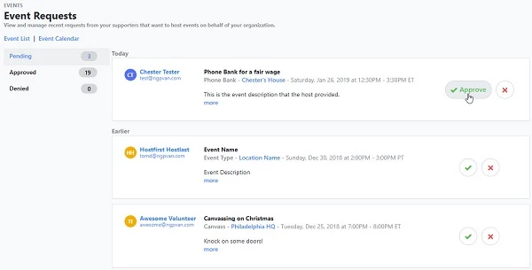 When Event Host request submissions come in, you can view them by clicking on Event Requests in Sidebar (or under 'Events' on the Main Menu).