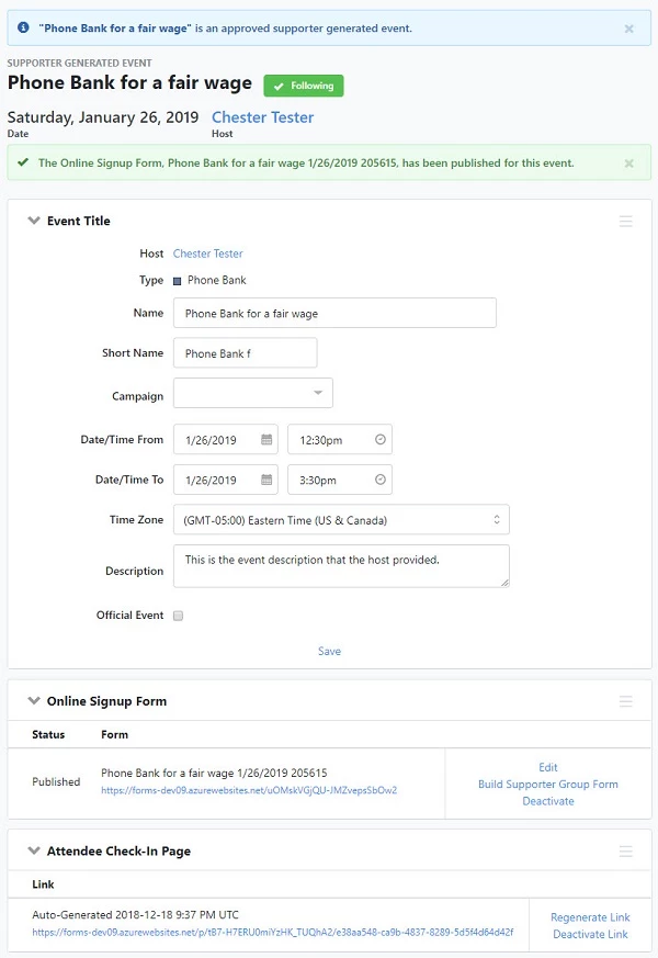 - An Event Signup Form will be published in Online Actions – this form will be tied to the Event
