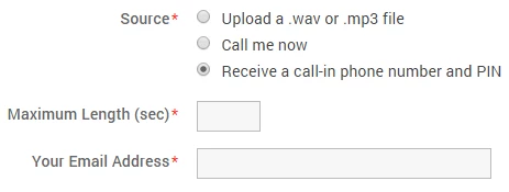 To receive a call-in number and PIN for you or another person to record the message at a later time, select Receive a call-in phone number and PIN. Designate the maximum length (in seconds) you want the recording to run. Enter in your email address. VAN will send you an email for you to distribute. If the recording is for a RoboSurvey element, the email provided will have a script form which your recording talent can read.