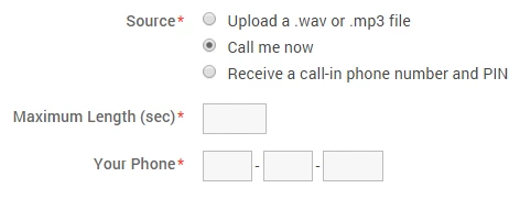 To have the system call you to record a message, choose the Call Me Now option. Designate the maximum length (in seconds) you want to the recording to run. Enter the phone number you want the system to call, you will receive the call in about 45 seconds. Follow the instructions given during the call to record, review, and save the call.