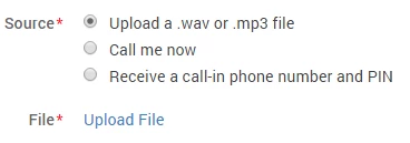 To upload a .wav or .mp3 file, select Upload a .wav or.mp3 file and an Upload File link will appear in the box below your options. Click on the Upload File link and follow the instructions to upload from your computer or network.