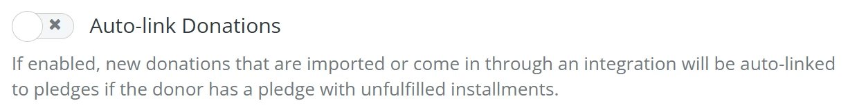 Auto-link Donations: when enabled, this feature will automatically link any donations made by a donor who has set up a pledge directly to that pledge; in other words, every donation the donor makes moving forward will count towards their pledge goal
