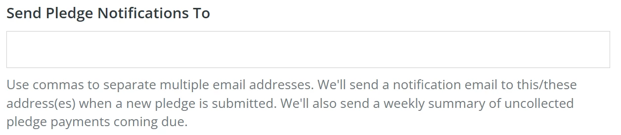 Send Pledge Notifications To: add e-mail addresses of those in your organization who should be notified of new pledge form submissions and receive weekly reminders of upcoming pledge payments within the next 30 days