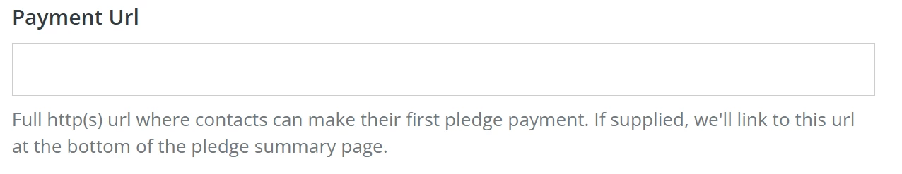 Payment Url: enter the URL of one of your fundraising pages, where your donors can make their first pledge payment