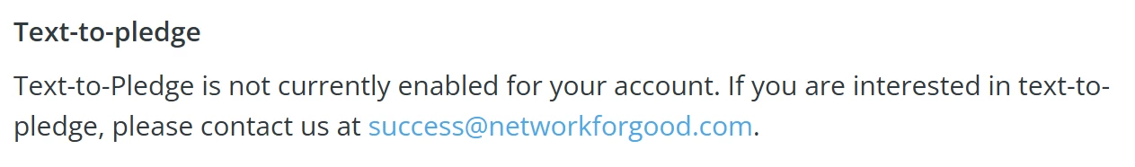 Text-to-Pledge: when enabled, allows your donors to text a specific phone number and make a pledge via their mobile device