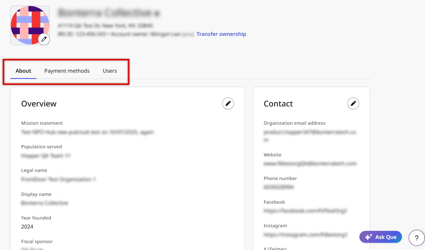 - FrontDoor account owners can edit their organization profile, including their mission statement, theme color, contact information, etc., as well as set up their preferred payment method and manage users.