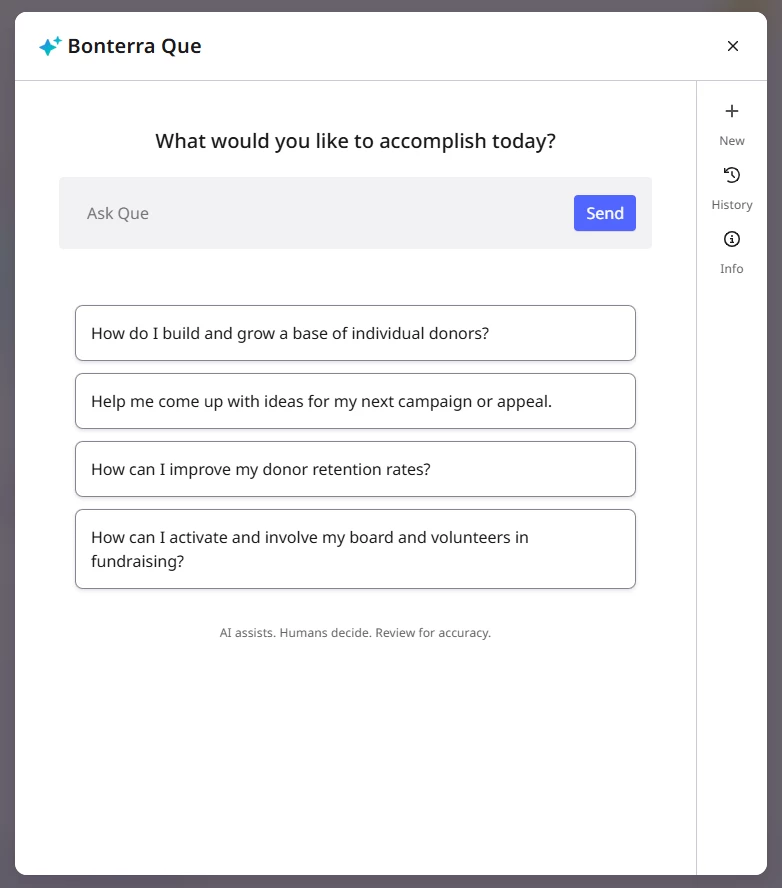The Bonterra Nonprofit Hub does not include a built-in support ticketing system. However, it does offer chat to help with general guidance on using Nonprofit Hub tools. Our AI chat bot can answer common questions and escalate to human support if needed.