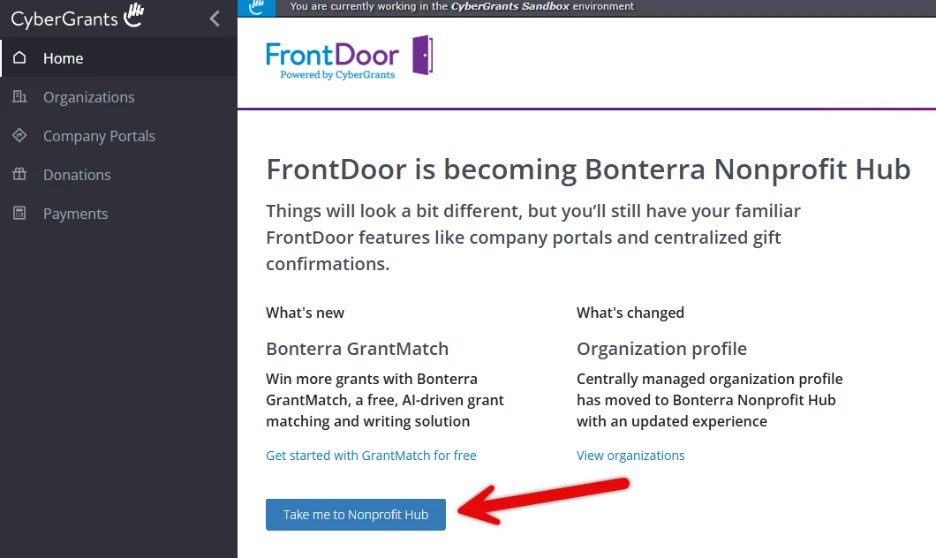- If you are new to FrontDoor and haven’t accessed the Nonprofit Hub, start here: How do I register my nonprofit in the Bonterra Nonprofit Hub?.