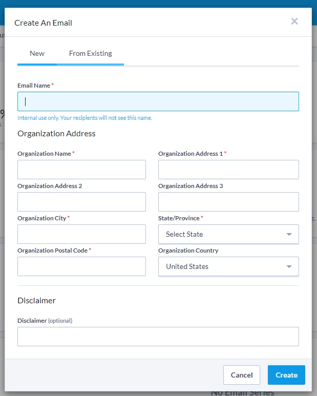 - Create from Existing to select a previous email to copy. You can then decide whether you want to include the same audience and then add or edit information as you would when you Create New.