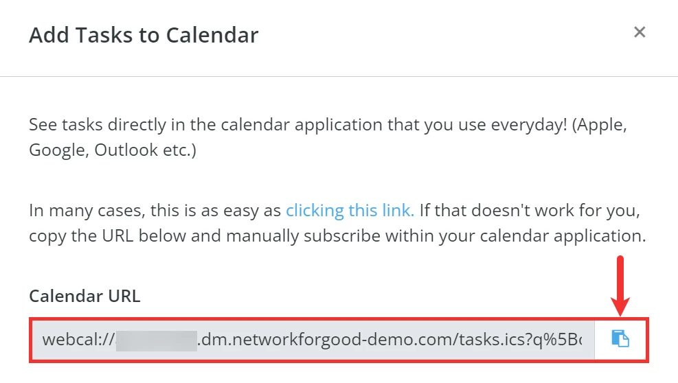 Finally, after you click the first link within the pop-up window or copy the 'Calendar URL', you can follow the instructions for your preferred calendar application to manually add or subscribe to your new 'Tasks' calendar.