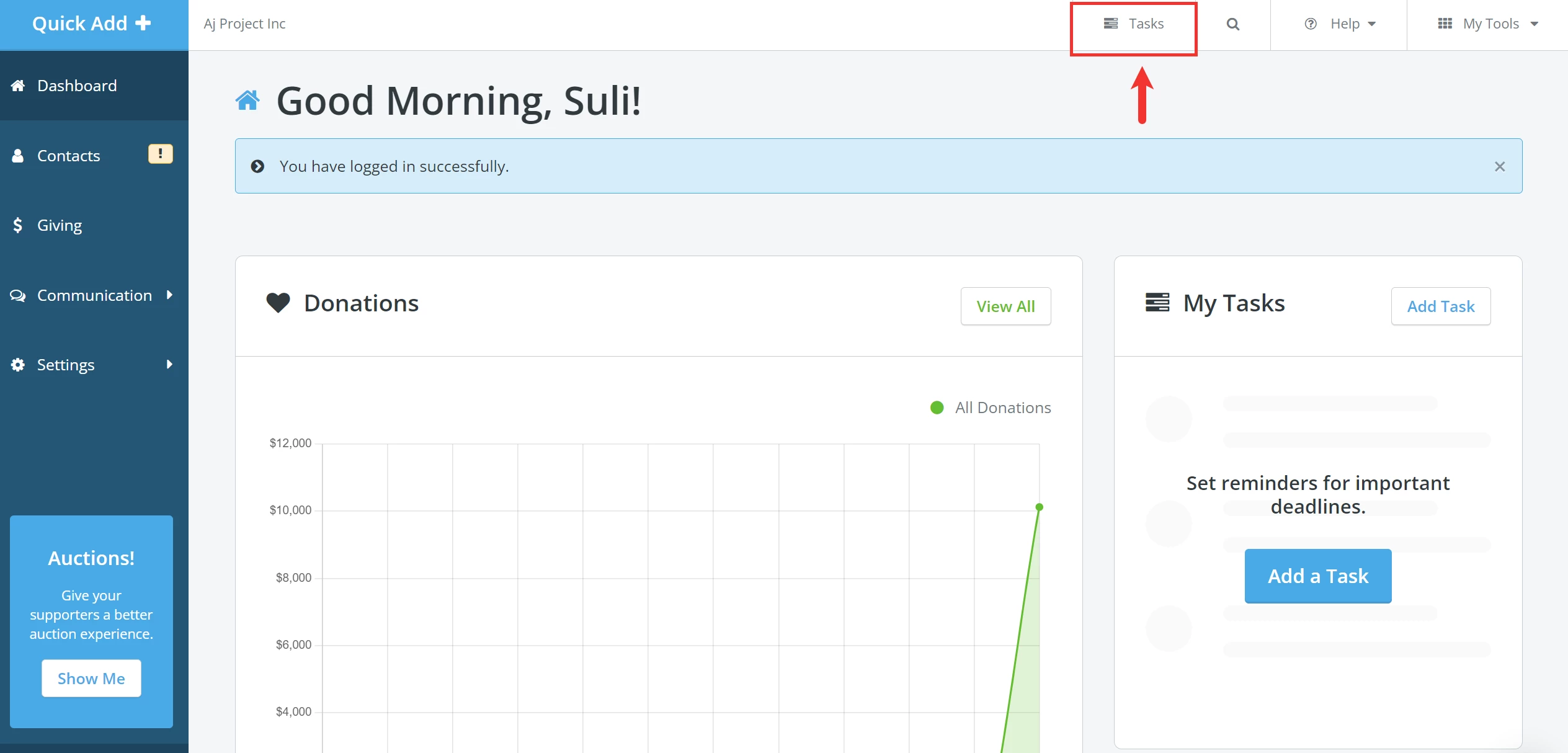 From your 'Donor Management' Dashboard, click 'Tasks' in the top right navigation bar.