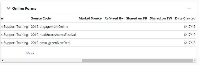 Shared on Twitter: Whether someone clicked on the Twitter share button after submitting the form. You must have enabled Show Twitter Share Button in the Confirmation Page settings of the form, and chosen to redirect supporters to a Thank You Page after submitting the form.