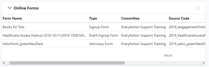 Use the Online Forms section on a person's contact record to view their form submission history. This section will display one row per form submission.