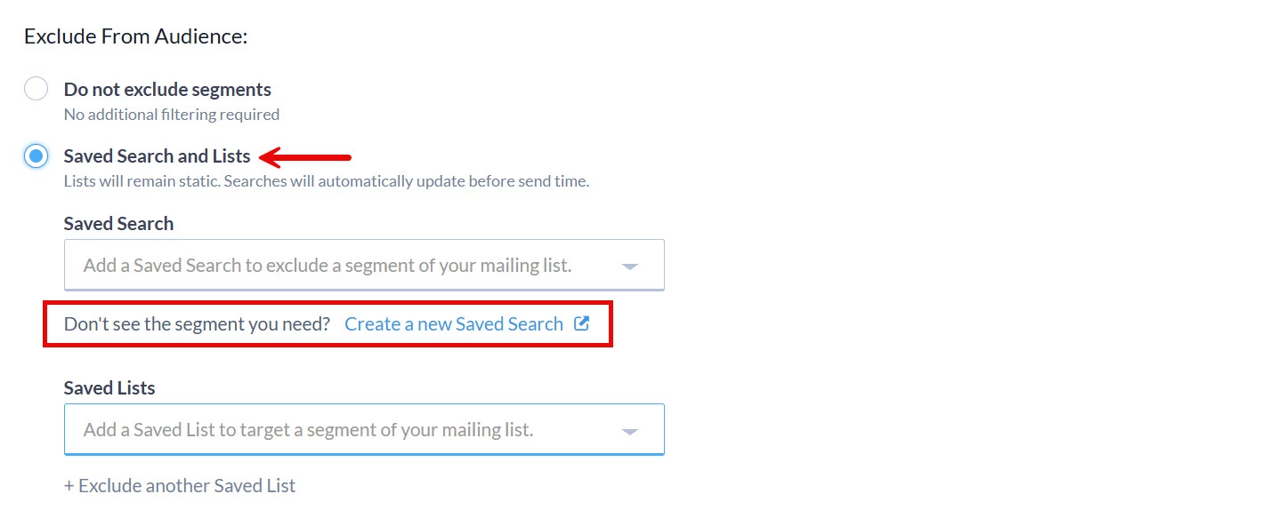 Navigate back to the 'Targeted Email' Dashboard and resume setting up your campaign. In the 'Select Recipients' step, click the radio button next to 'Saved Searches and Lists' under the 'Exclude From Audience' section and select the list you just created from the 'Saved Lists' drop-down.