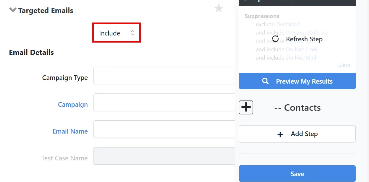A pop-up window should appear - navigate to the 'Targeted Emails' section and click to open the drawer. Select 'Include' from the first drop-down list.