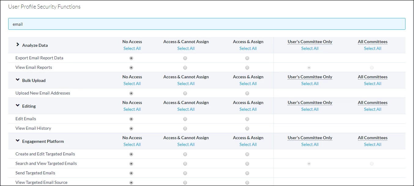 Certain security functions will include the option to select between User's Committee Only and All Committees: