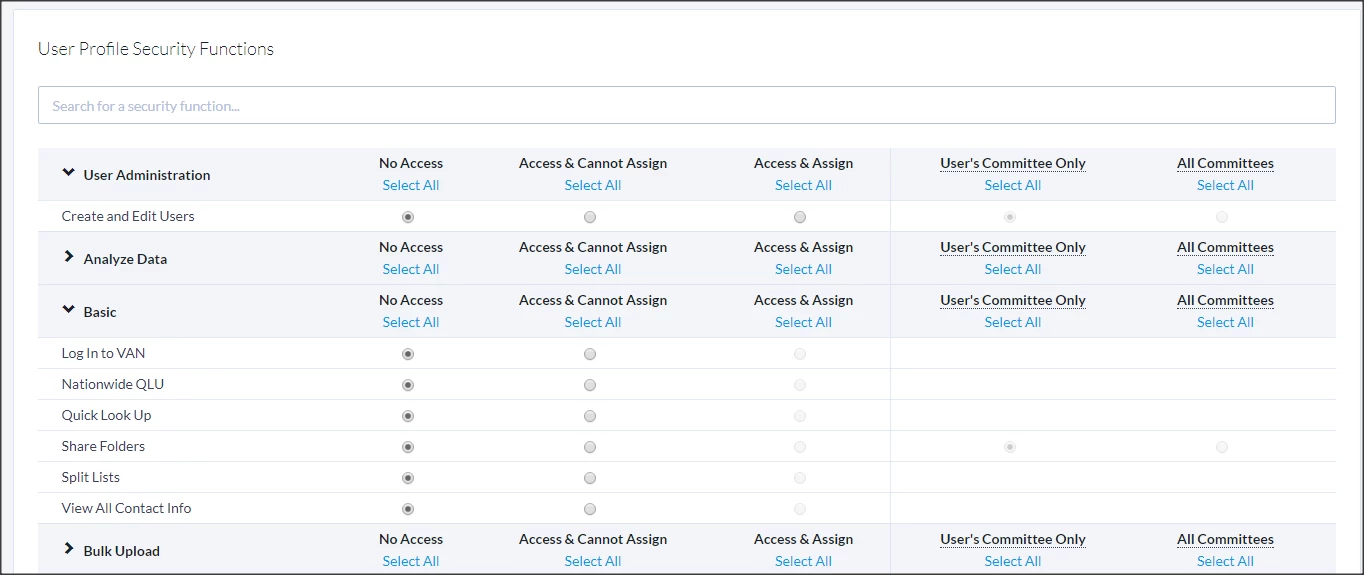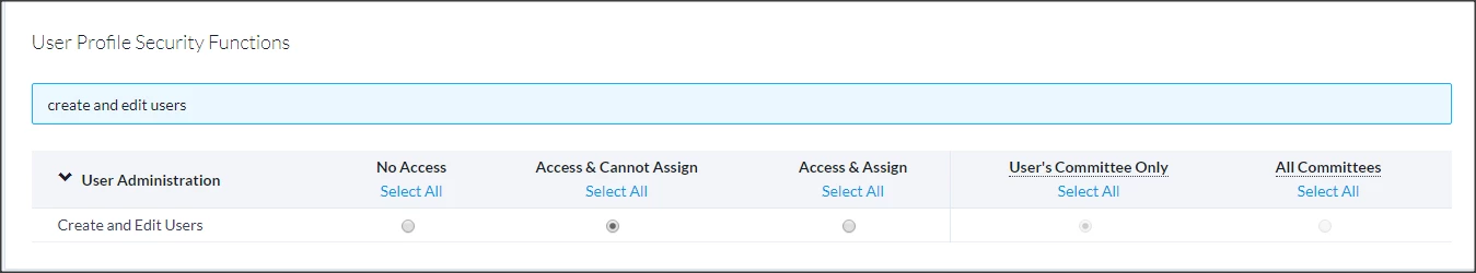 - User’s Committee Only – This setting implies that the user with this function can only perform the task on the specific committee(s) to which they have explicit access on their user account.