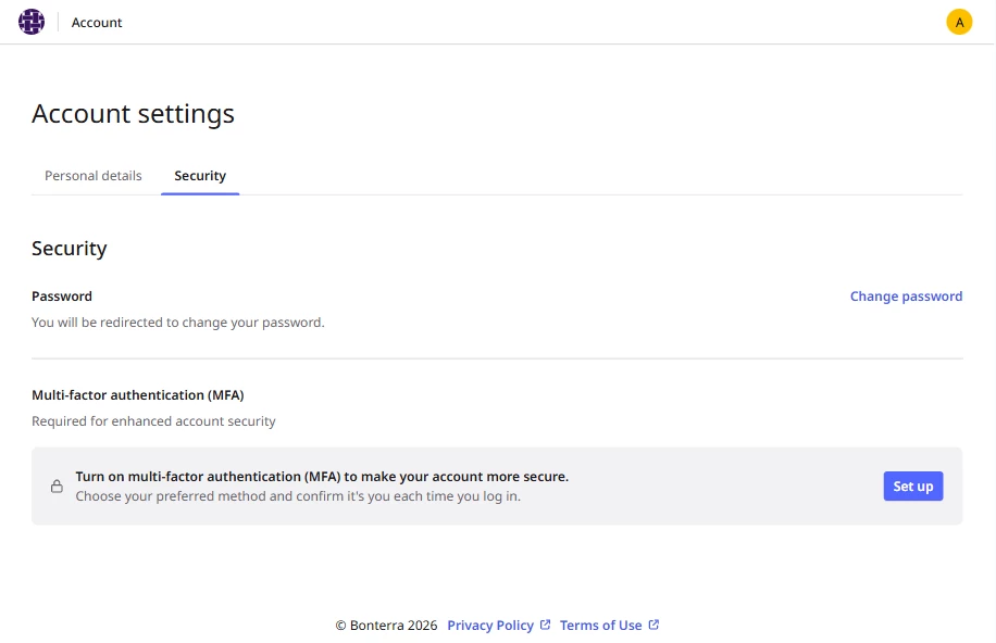 With this new experience, you'll now be able to manage your Bonterra account through our new Bonterra Account Center. This is a centralized space for users to manage core account settings like name, password, MFA, and other account-level settings.