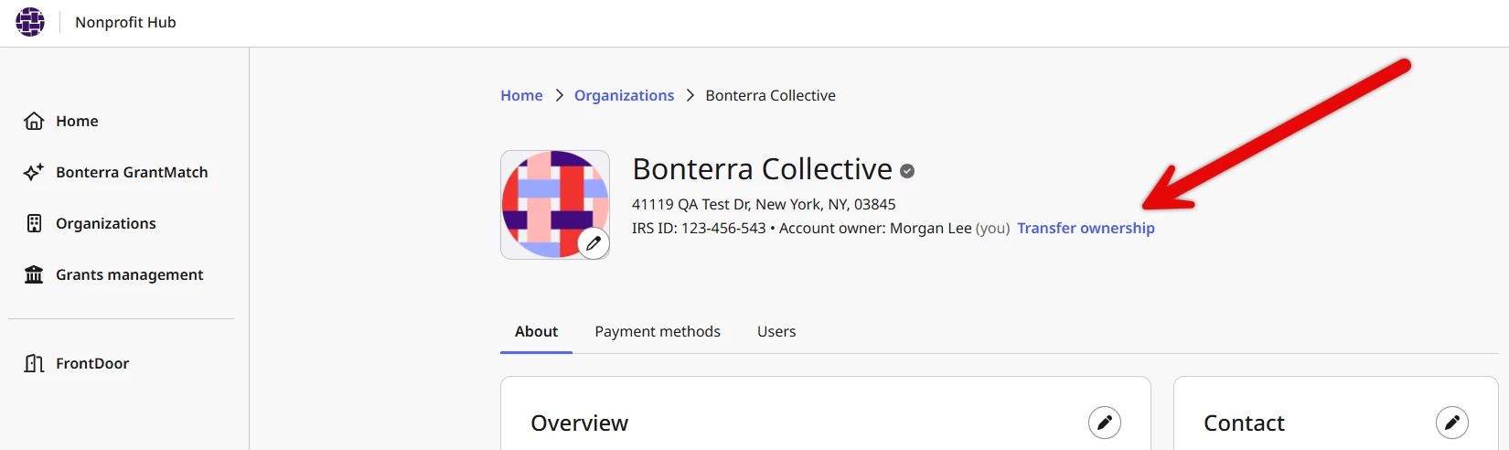 Note: Users designated as owners of their organization’s FrontDoor account are referred to as Verified Owners in the Nonprofit Hub.