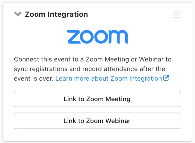 Once you've created your event, open the Event Details page and expand the Zoom integration section. To set up the integration, choose whether you are linking to a Zoom Meeting or a Zoom Webinar. These are separate integrations, so be sure to choose the correct type for your event.