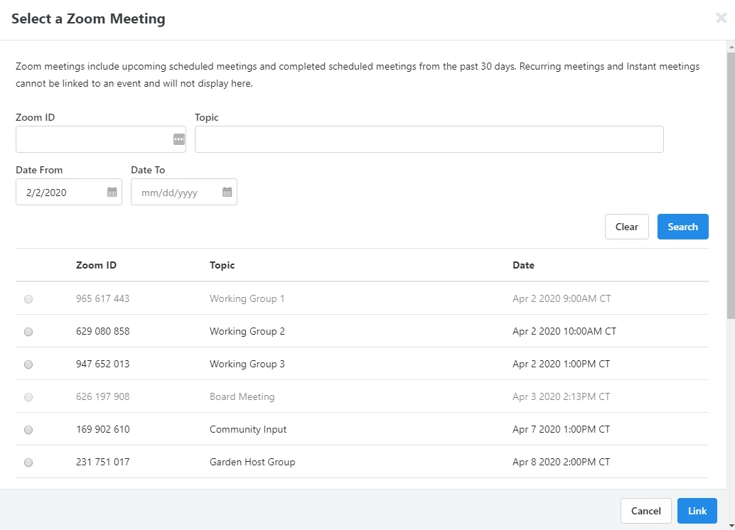 If you have a data-sharing (multi-committee) setup, you can only link to meeting/webinars, refresh, and unlink from the committee that owns the event. Anyone looking at the event record from one of your data-sharing committees can see the Zoom details, but they will not be able to change or update the link.