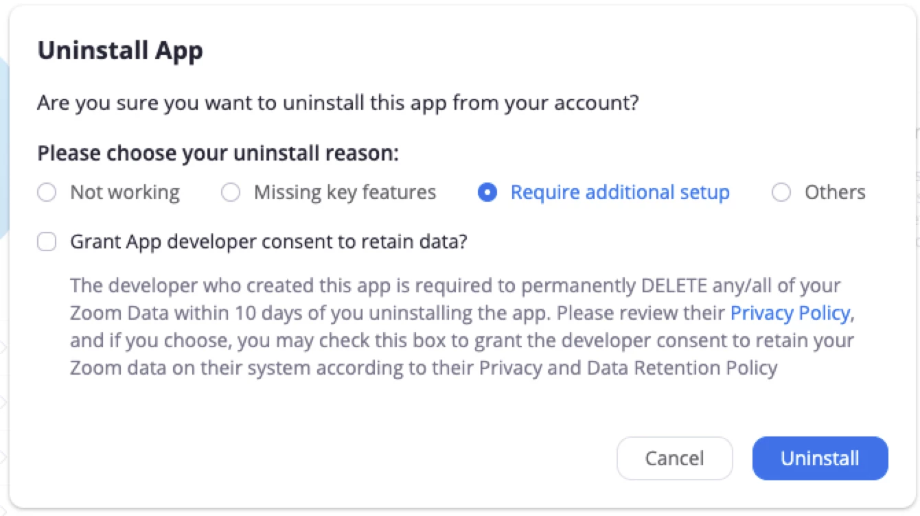 If you do not grant us permission to retain your data that came through this integration, we can only grant 7 days for you to change your mind. After that, your data will be queued for removal, since we are required to delete all the data that came from Zoom within 10 days, including things like event signups, contact records, phone numbers, emails, and addresses.